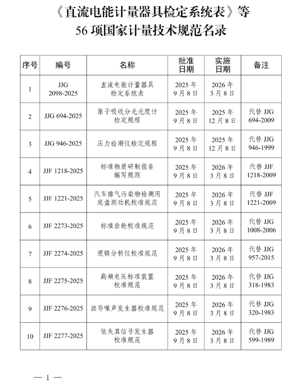 根据《中华人民共和国计量法》有关规定,批准《直流电能计量器具检定系统表》等56项国家计量技术规范发布实施,现予公告。