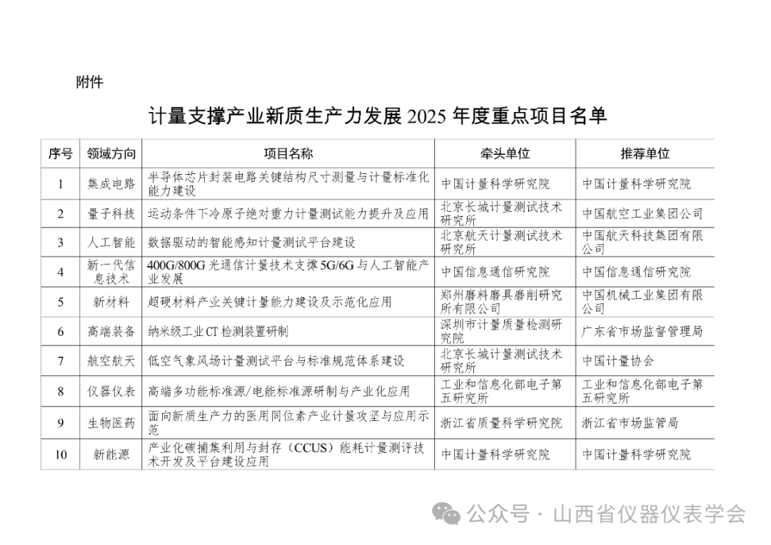 关于计量支撑产业新质生产力发展2025年度重点项目名单的公示